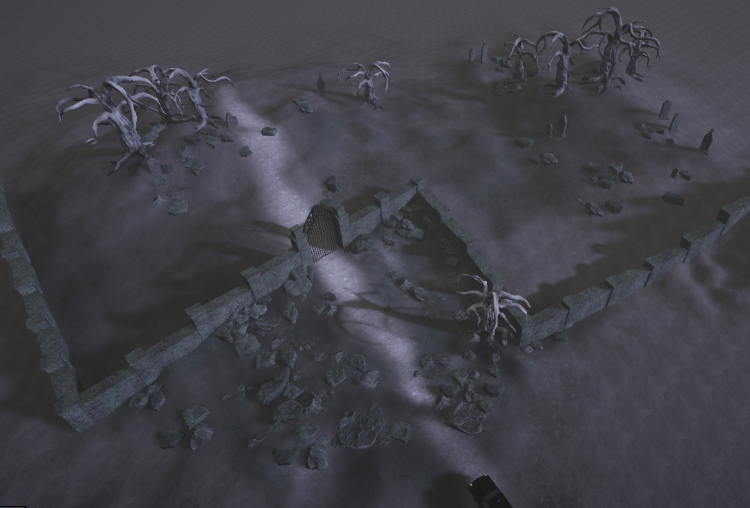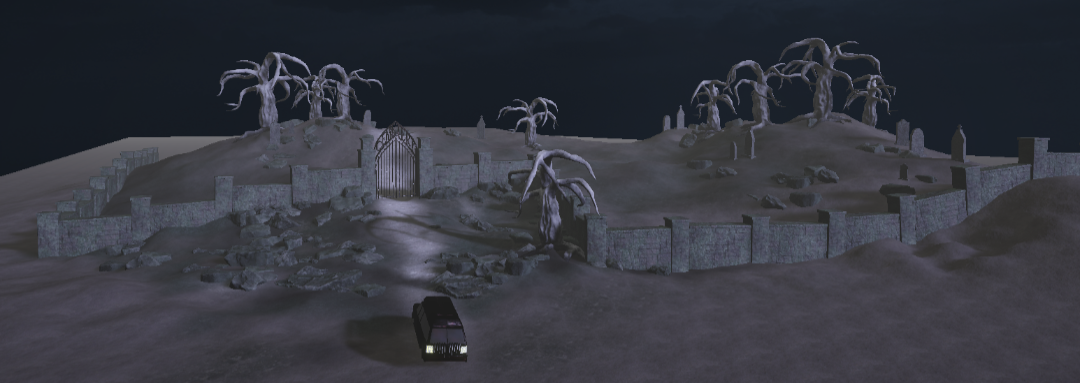 Design einer Unity-Szenerie, in der sich ein Leichenwagen langsam durch eine karge Landschaft bewegt und schließlich in einen abgelegenen Friedhof einfährt.