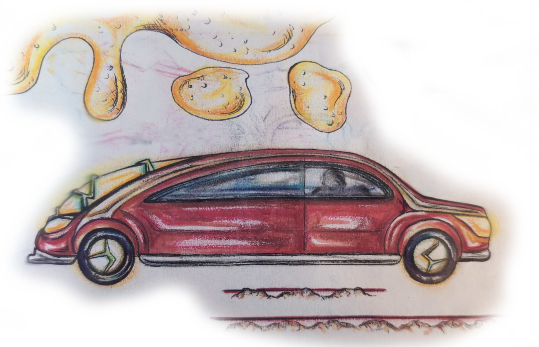 Die Limousine soll durch eine Wüste fahren, die von erdnussförmigen Felsen geprägt ist. Dort legt sie auch einen Stopp an einer Tankstelle ein, um den Öltank aufzufüllen. Diese hat eine lange, schmale Form, wie der Stängel einer Pflanze, die aus dem Boden wächst, gekrönt von einer gläsernen Ölblase an der Spitze.
